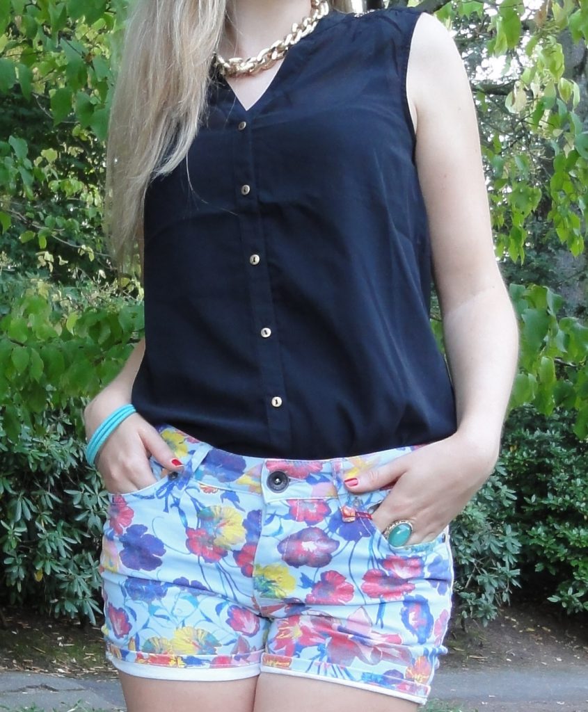 Bunte Hotpants Print Muster colofur Hot Pants kombinieren rosa blau Highheels schwarze Bluse Modeblog Bonn Rheinaue 4