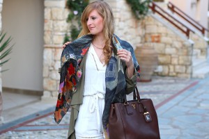Während meines Urlaubes in Griechenland zeige ich mein Streetstyle Outfit mit weißem Jumpsuit, buten Tuch und meiner braunen Prada Tasche.