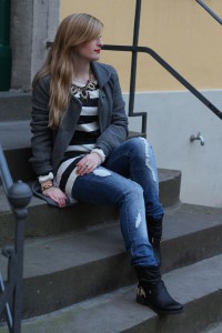 gestreifter Pulli und ripped Jeans
