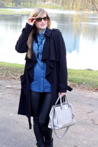 Ein Winter Outfit auf meinem Modeblog für wärmere Wintertage mit einem schwarzen Trenchcoat, einer blauen Jeansbluse von Seidensticker kombiniert mit einer Lederleggins und schwarzen Biker Boots von Görtz. Abgerundet mit meiner Michael Kors Tasche mit Schlangenmuster in grauen Leder.