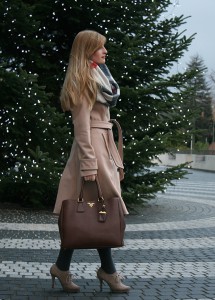 Zu Weihnachten im OOTD trage ich einen beigen Wintermantel Mantel Klassiker von Mint & Berry mit einer braunen Prada Tasche und einem Rundschal Burberry auf meinem Modeblog