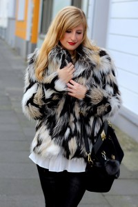 In meinem Weinachtsoutfit trage ich eine schicke Kunstfelljacke mit Muster. Zu meinem OOTD Weihnachten kombiniere ich noch eine schwarze Michael Kors Handtasche mit Kunstfell, eine weiße Bluse und eine schwarze Skinny Jeans von Zara und schwarze Stiefel hoch von Asos. Mehr dazu auf meinem Modeblog.