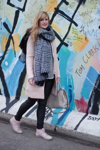 Layering Rosa Mantel Zara schwarz weiß karierter Schal Rosa Puma Sneaker Alexander McQueen streetstyle Blog Berlin 1