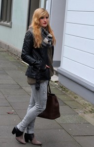 Casual Look für den Alltag: Graue Ripped Jeans und coole Stiefeletten mit schwarzer Lederjacke und braune Prada Tasche Leder kombinieren auf meinem Mode Blog OOTD in Köln