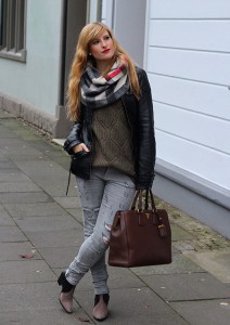 Casual Look für den Alltag: Graue Ripped Jeans und coole Stiefeletten mit schwarzer Lederjacke und braune Prada Tasche Leder kombinieren auf meinem Mode Blog OOTD in Köln