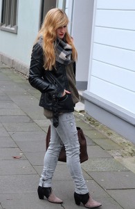 Casual Look für den Alltag: Graue Ripped Jeans und coole Stiefeletten mit schwarzer Lederjacke und braune Prada Tasche Leder kombinieren auf meinem Mode Blog OOTD in Köln