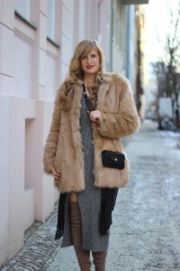 Mein MBFW Fashion Week OOTD Berlin Outfit zeigt ein langes Wollkleid von Asos, braune Overknees bzw. Overknee Stiefel, Fake Fur Jacke Felljacke Zara auf meinem streetstyle Blog Modeblog.