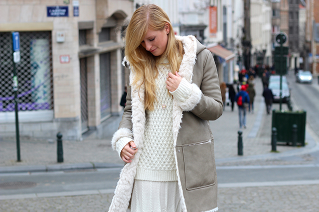 Mein heutiges Outfit besteht aus grünen Overknees von Sacha, Zara Ledermantel mit Fell, Overknee Stiefel, Nude Wollkleid und goldenen Schmuck auf meinem Fashion Look Modeblog. Fotografiert in Brüssel.