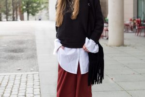 Weinrote Culotte kombinieren im OOTD Outfit mit Fransen High Heels JustFab. Layering mit weißer Bluse mit Trompetenärmeln und Pullover im Frühlingslook.