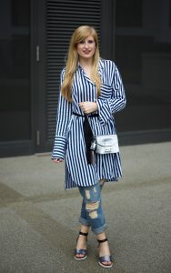 Boyfriend Ripped Jeans kombinieren OOTD blau weiß gestreifte Bluse Edited silberne Peperosa Sandalen mit Furla Metropolis silber im Fashion Look