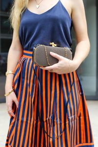 Gestreifter A-Linien Rock orange Blau Closet London blaues Top von Zara Rückenfrei im MBFW Look Marcel Ostertag Modeblag Brinisfashionbook