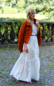 Weißes Maxikleid kombinieren Sommer Must-Have 2016 mit oranger Wildlederjacke von Tom Tailor in der Shooting Location Rheinaue Bonn auf meinem Modeblog BrinisFashionBook