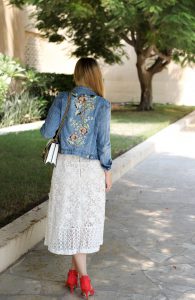 Orange High Heels Spitzenkleid Jeansjacke Stickereien Gucci Dionysus Outfit Modeblog summer street stlye 92