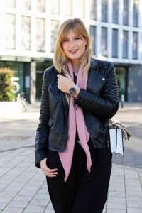 Herbsttrend Outfit mit Schwarzer Jumpsuit rosa Kaschmir Schal Gucci Dionysus vom Sparkle Store in Neuss mit toller Lederjacke auf meinem Modeblog
